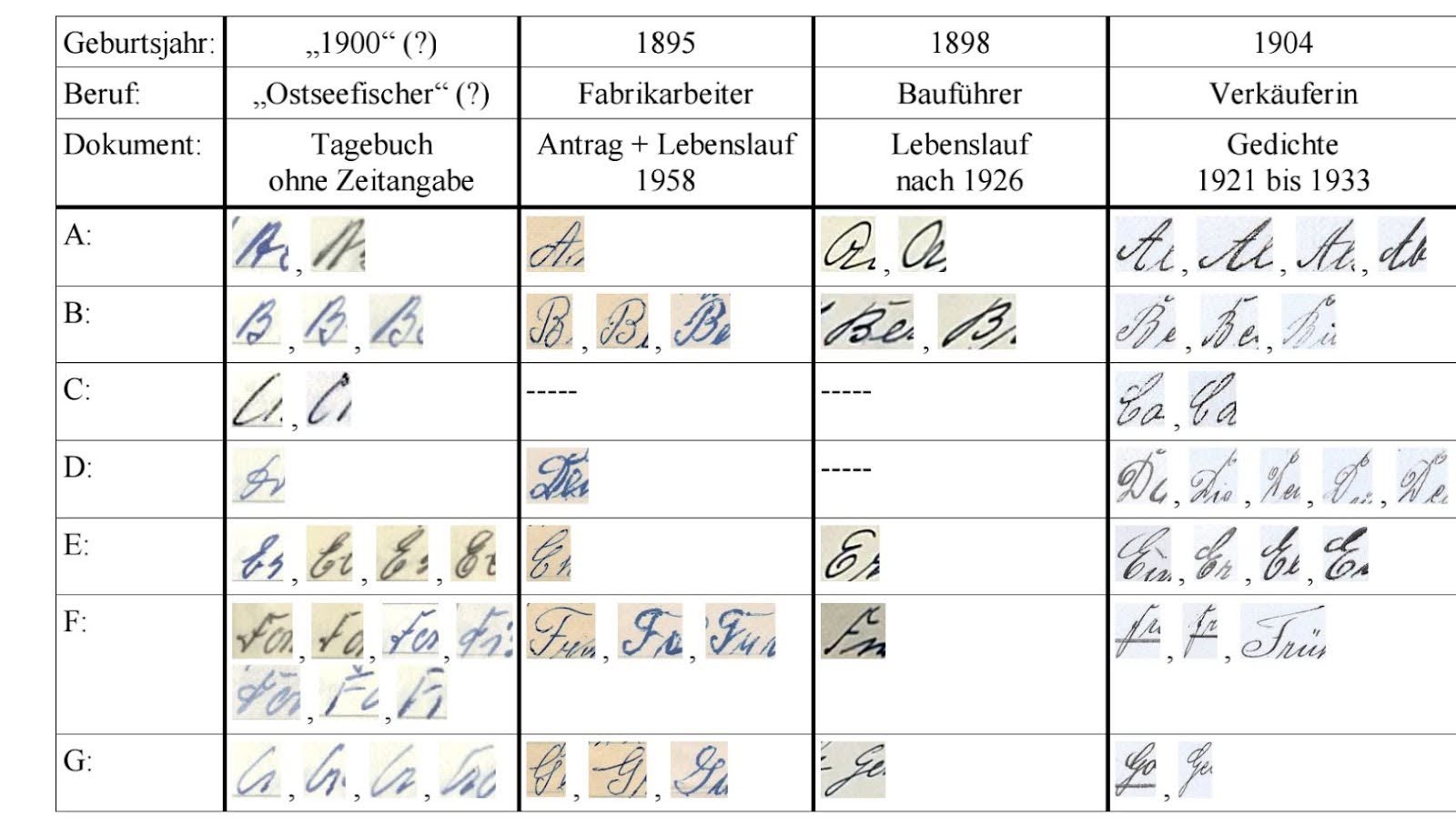 Meinem Mitarbeiter waren Zweifel an der Authentizität und somit an der wissenschaftlichen Verwertbarkeit der Aufzeichnungen gekommen. Er monierte, dass die Schrift nicht von Fiete geschrieben sein könne. Dies habe ein Gutachten* ergeben, welches er veranlasst habe, um festzustellen, ob die Schrift des Autors von einer um 1900 geborenen Person stammen könne. Nach Meinung des Gutachters hätte Fietes Schrift mehr Anklänge von 'Kurrent' haben müssen, die altdeutsche Schreibschrift, wie sie zur Schulzeit Fietes gelehrt wurde. Der Gutachter beschränkte sich dabei auf den Vergleich der Großbuchstaben, die er mit Schriftstücken von Personen aus der gleichen Zeit mit ähnlichem Bildungsabschluss verglich. Er kam zu dem Ergebnis, dass Fiete als Schreiber der Aufzeichnungen höchstwahrscheinlich nicht in Frage käme, weil die Schriftprobe auf eine später geborene Person rückschließen ließe, welche die Lateinische Ausgangsschrift gelernt haben müsste. Auch war dem Mitarbeiter als weitere Ungereimtheit aufgefallen, dass an einigen Stellen des Tagebuchs der angegebene Wochentag nicht mit dem dazugehörigen Datum übereinstimmte, sondern immer um einen Tag verschoben war.